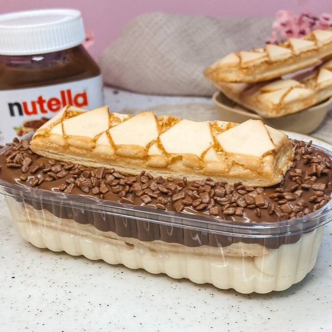 Creme de ninho, bolacha champanhe, nutella, mousse de ninho e mais nutella. 250gr