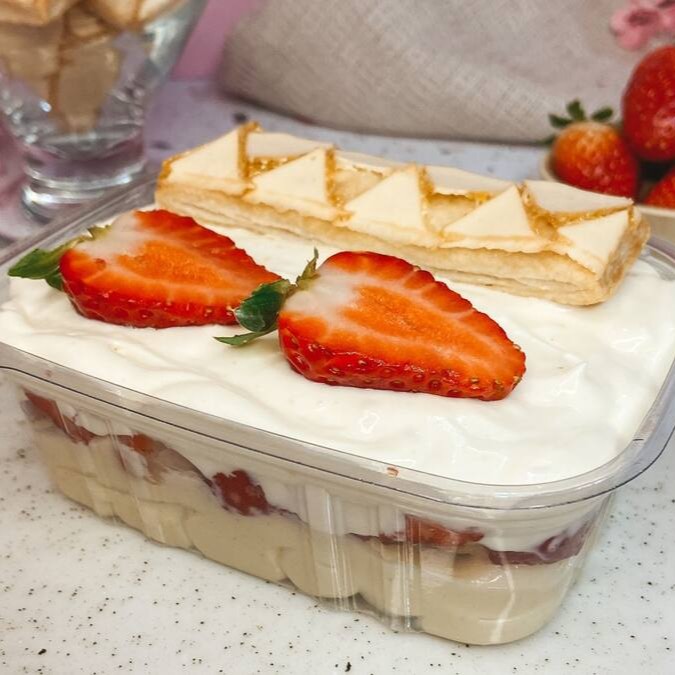 Creme de ninho, biscoito folhado italiano e morangos.