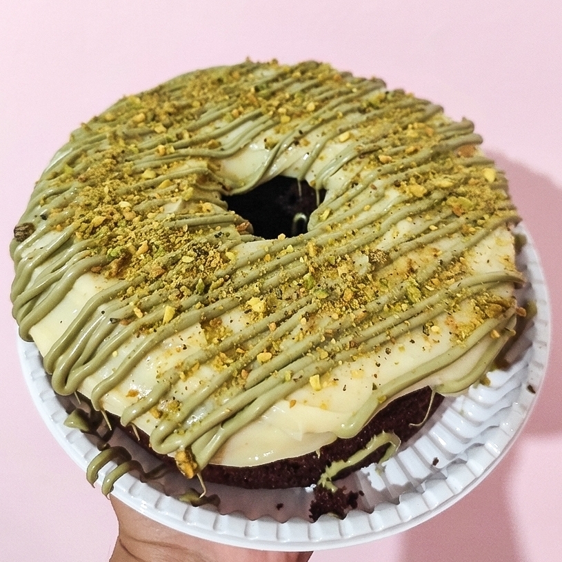 Massa de chocolate, coberto com brigadeiro de leite ninho e creme de pistache. Serve de 8 a 10 fatias.
