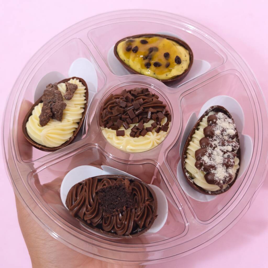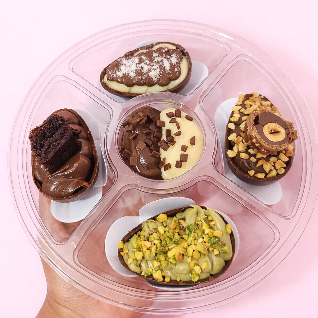 4 mini ovos de 50g, feitos com chocolate nobre. Sabores, ninho com Nutella, Ferrero, brownie e ninho com pistache.