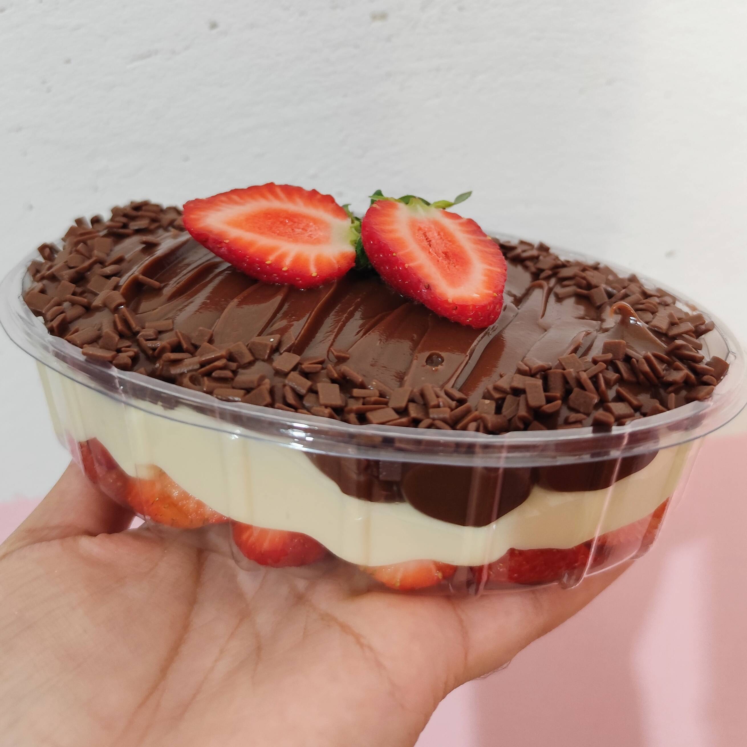Composto por morangos, creme de leite ninho, brigadeiro, finalizado com granulado de chocolate ao leite e morangos. Serve até 4 pessoas