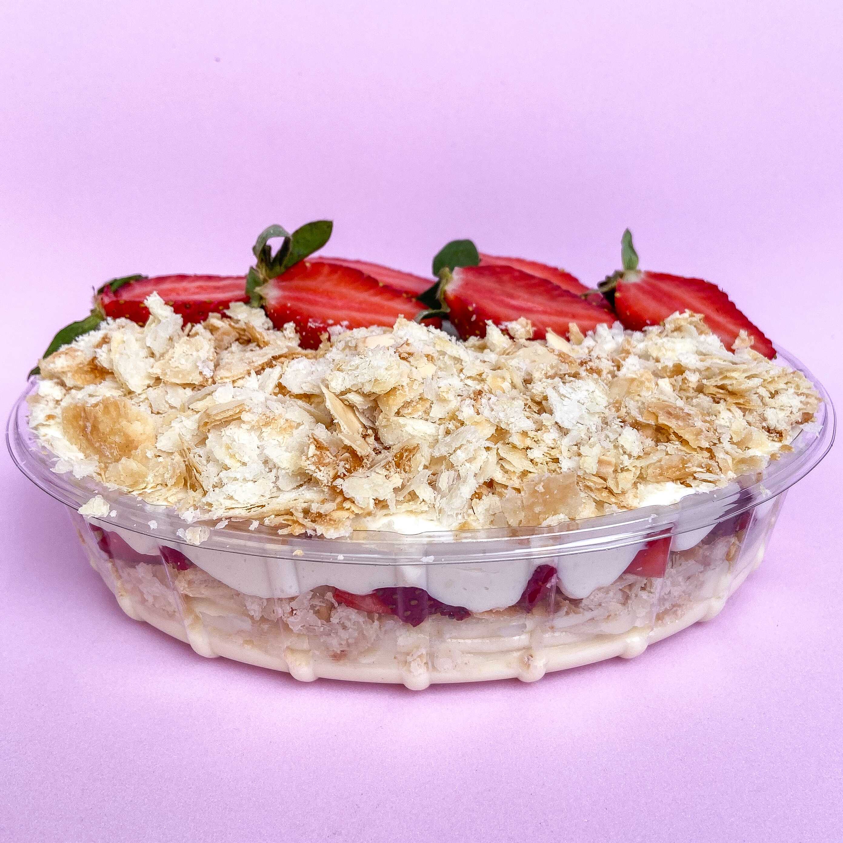 Composto por dois cremes maravilhosos de leite Ninho, biscoito folhado sfogliatine e morangos frescos. Uma explosão de sabores ️ Aproximadamente 500g