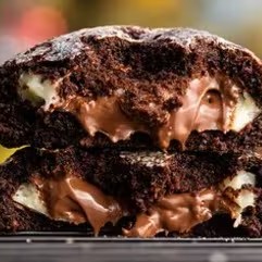 Cookie na massa de chocolate, estilo americano, recheado com brigadeiro de leite Ninho cremoso e Nutella pura, coberto com leite Ninho em pó e risquinhos de Nutella.