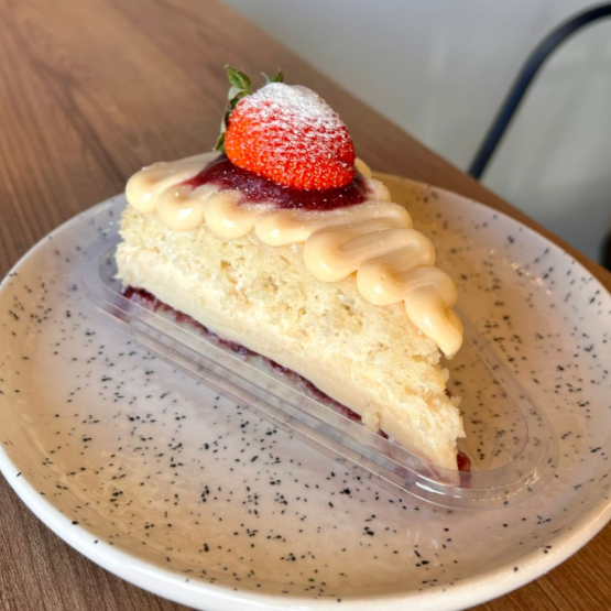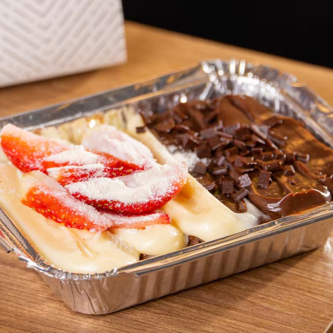 Nosso famoso brownie une três paixões: casquinha crocante e cobertura de Ninho com brigadeiro, morangos frescos picados na hora e massa bem molhadinha!