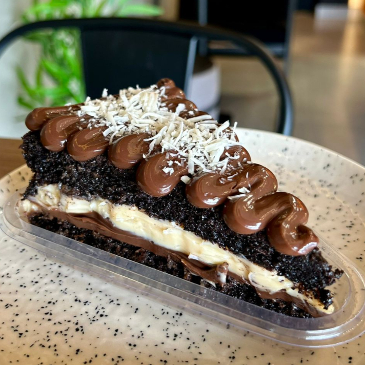 Massa de bolo de cacau black, úmida e recheada com brigadeiro belga e cocada.