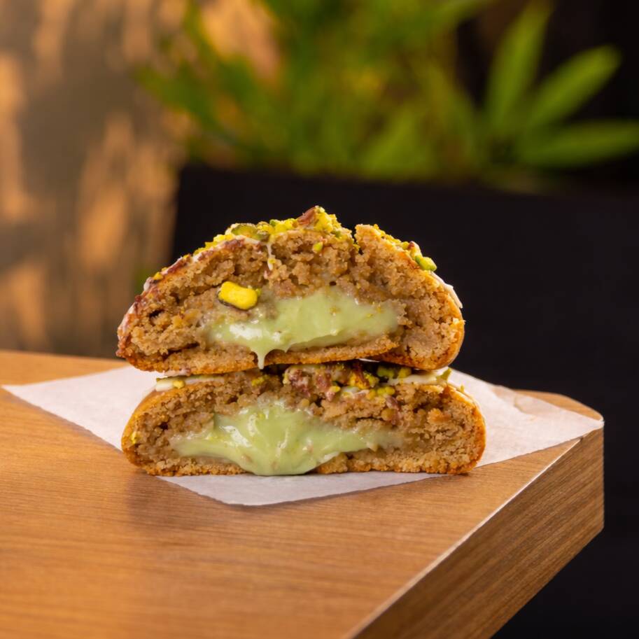Massa de cookie estilo americana, muito crocante por fora, úmida na medida certa por dentro, muito recheio cremoso de pistache de verdade, coberto com pedaçinhos de pistache triturado e risquinhos de pistache- 120g