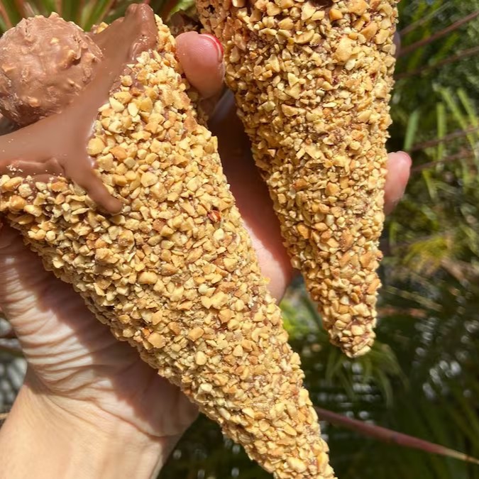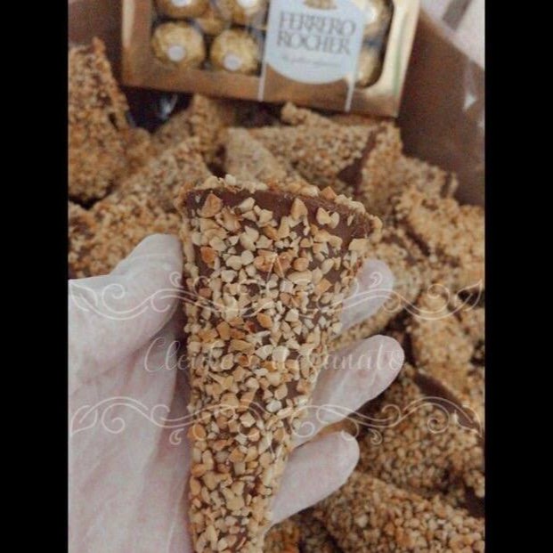Delicioso Cascone banhado no chocolate ao leite, coberto por castanha e com recheio gourmet de Ganache de chocolate com amendoim, Nutella e Bombom Ferrero Roche