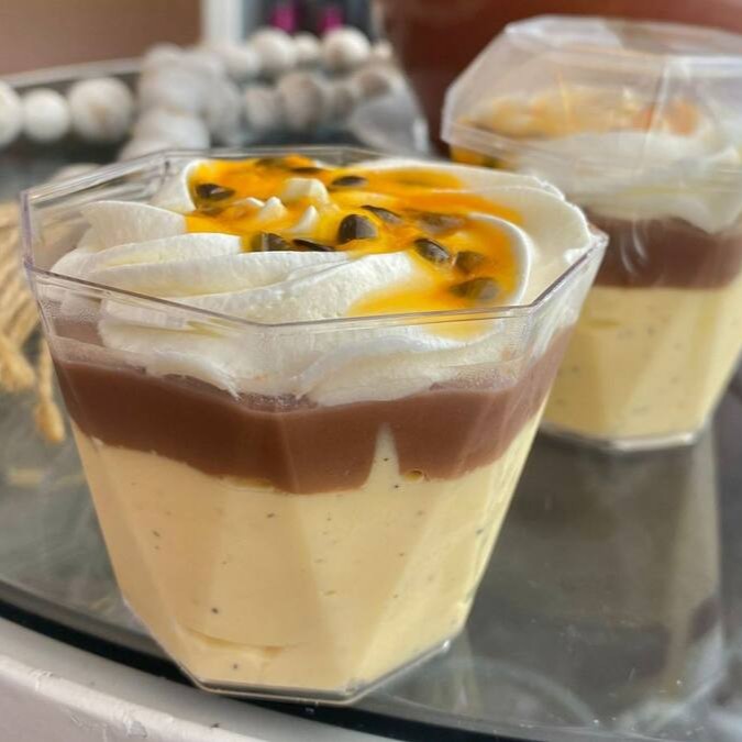 2 deliciosos mousses de maracujá com ganache de chocolate, chantilly e geleia caseira de maracuja.