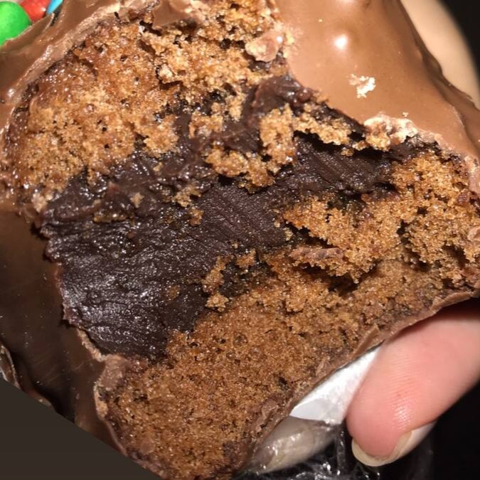 uma deliciosa massa de pao de mel recheado com doce de leite, banhado com chocolate ao leite.