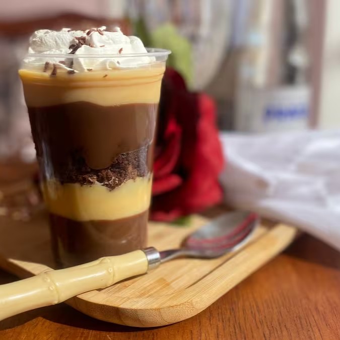 Creme de pavê, banana, doce de leite , farofa de bolacha e chantilly com canela