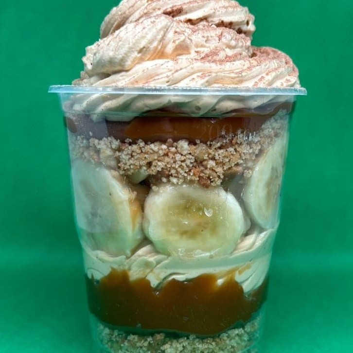 Uma sobremesa irresistível que une o melhor da Banoffee! Nosso Copo da Felicidade de 200 ml é recheado com doce de leite cremoso, biscoito triturado, fatias frescas de banana, mousse de doce de leite e finalizado com uma generosa camada de chocolate ao leite em pó. Cada colherada traz uma combinação perfeita de texturas e sabores que vão conquistar seu paladar. Ideal para quem ama a clássica Banoffee, em uma versão prática e deliciosa!
