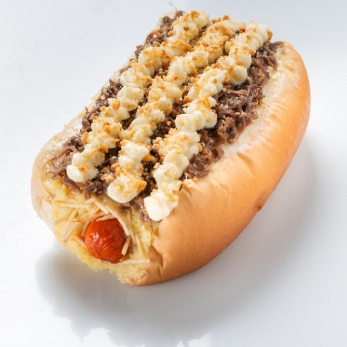 Pão, 2 salsichas, catchup, mostarda, molho de tomate, milho, vinagrete, batata palha, uma generosa camada de purê, queijo ralado, maionese e alho frito + Ragu (fraldinha desfiada ao vinho) + Cream Cheese.