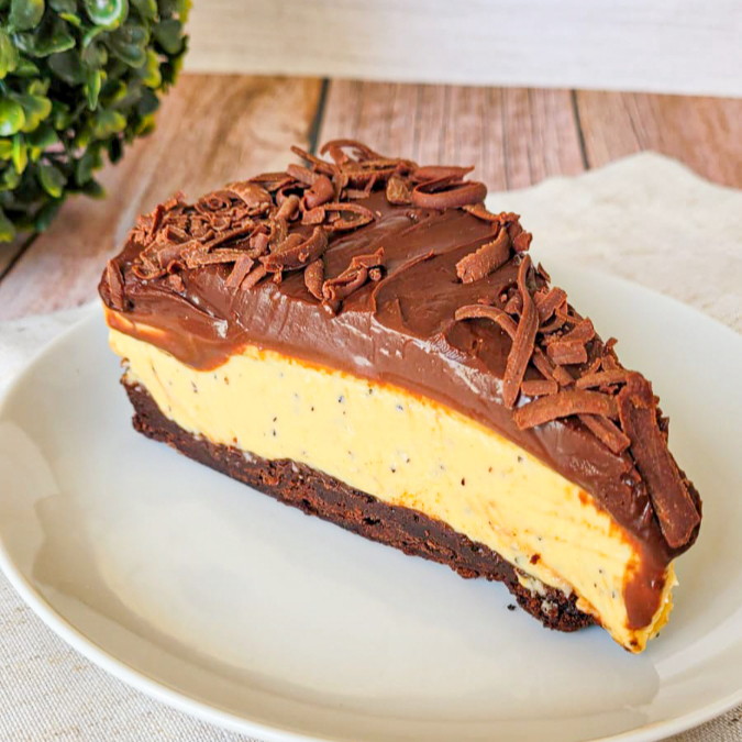 Deliciosa torta com mousse de maracujá feito com a fruta fresca, sobre uma base de brownie preparado com chocolate nobre. Finalizada com ganache cremosa de chocolate e raspas de chocolate que dão o toque perfeito