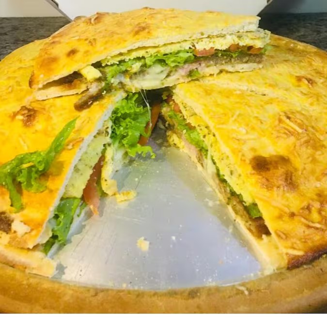 Mussarela, frango, presunto, ovo, bacon, catupiry, orégano e azeitona