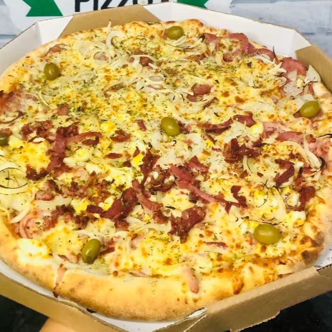 Mussarela, calabresa, cebola, bacon, catupiry, orégano e azeitona