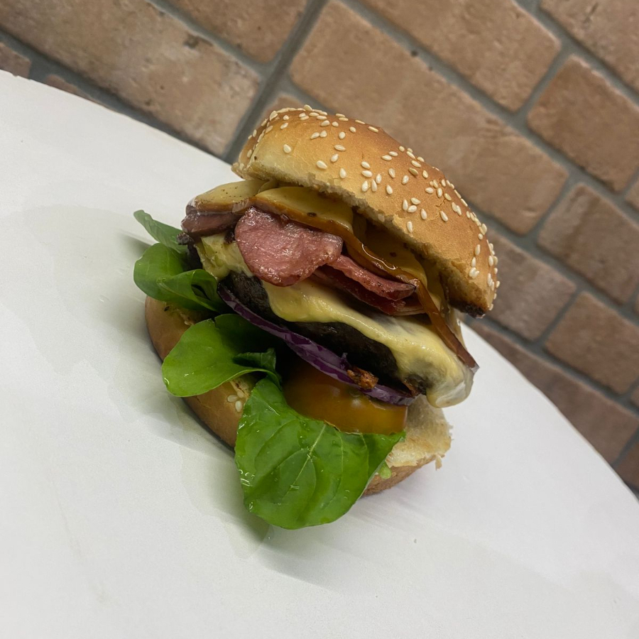 Pão de Brioche, Hamburguer de 150g, presunto, queijo prato, cebola rocha calabresa, salada e maionese temperada