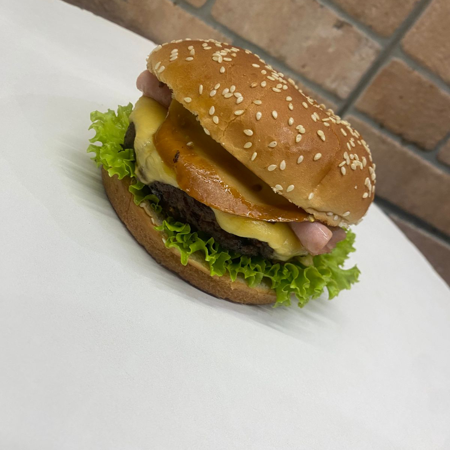 Pão de Brioche, Hamburguer de 150g, presunto, queijo prato,cebola rocha, salada e maionese temperada