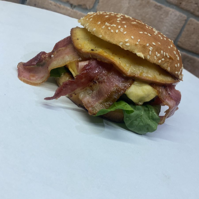 Pão de Brioche, Hamburguer de 150g, presunto, queijo prato, calabresa, bacon, cebola rocha e maionese temperada