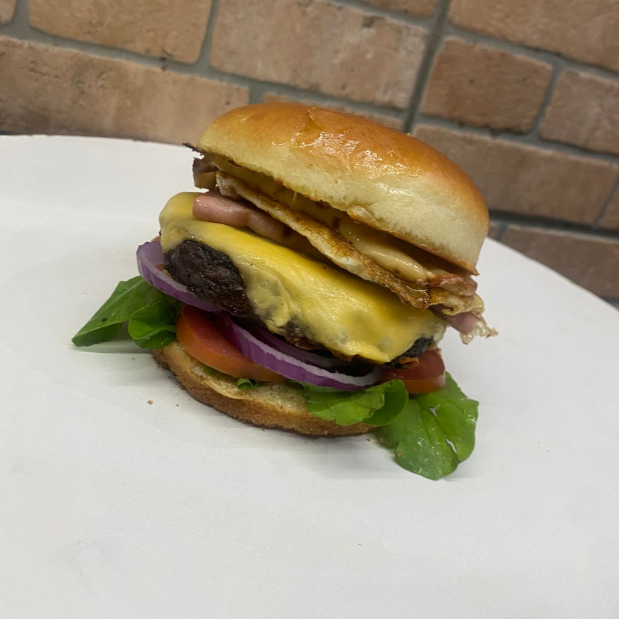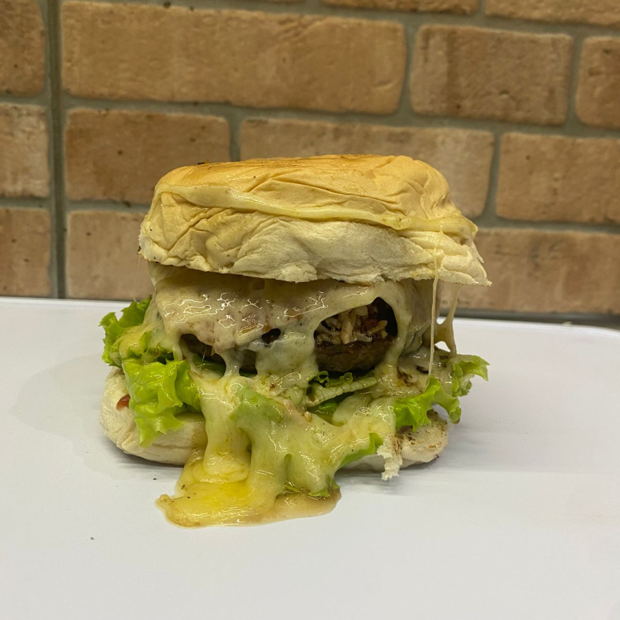 Hambúrguer, mussarela, presunto, milho, omelete, alface, tomate, maionese