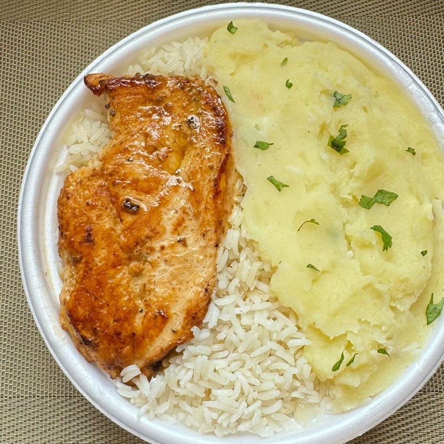 Marmita com delicioso filé de frango grelhado acompanhado de arroz branco, feijão e purê. Marmita indicada para 01 pessoa aproximadamente 750g