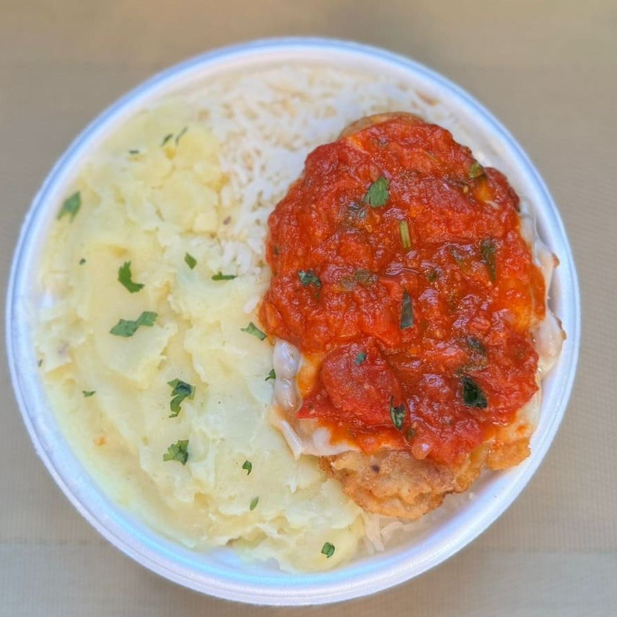Marmita com delicioso filé de frango parmegiana (empanado coberto com molho e queijo) acompanhado de arroz branco e purê. Marmita indicada para 01 pessoa aproximadamente 500g