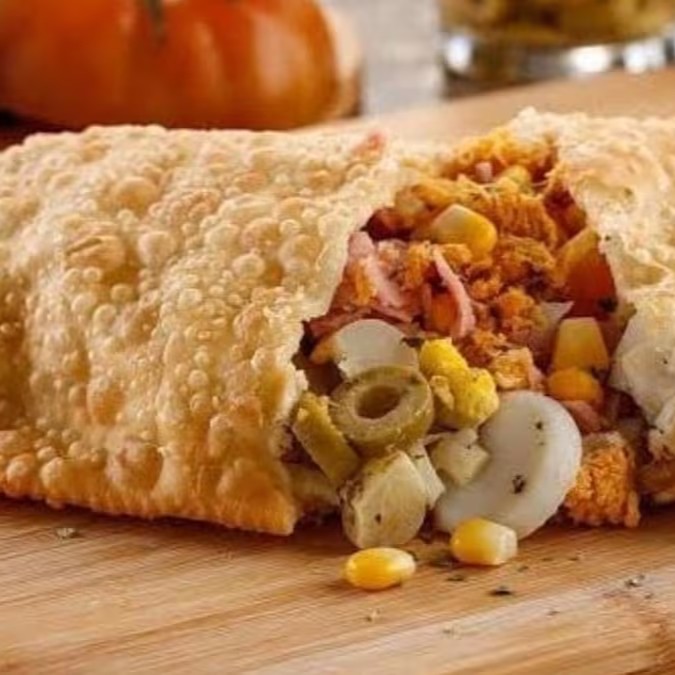 Recheado com Carne Moída, Queijo Mussarela, Presunto, Palmito, Frango Desfiado, Lombo, Calabresa, Milho e Catupiry Cremoso.