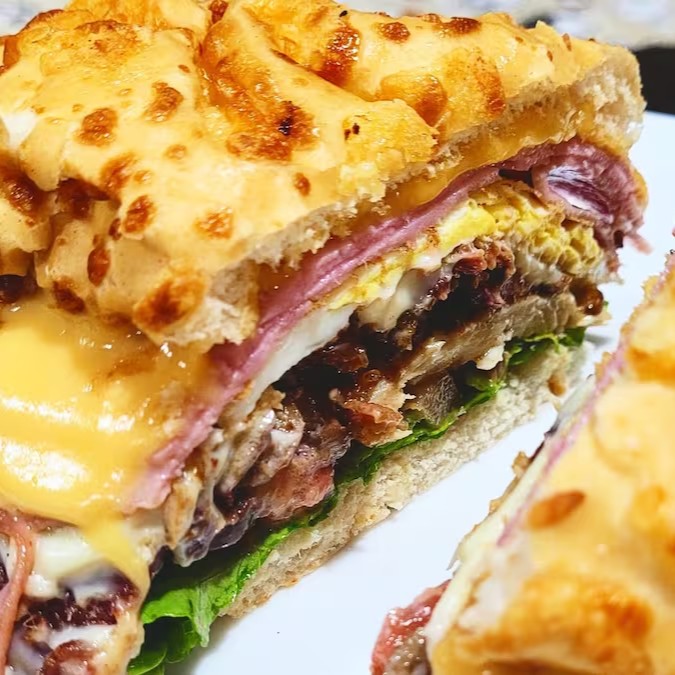 Delicioso contra-filé no pão de baguete, presunto, queijo, bacon crocante, ovo, azeitona preta, alface e tomate e acompanha maionese temperada