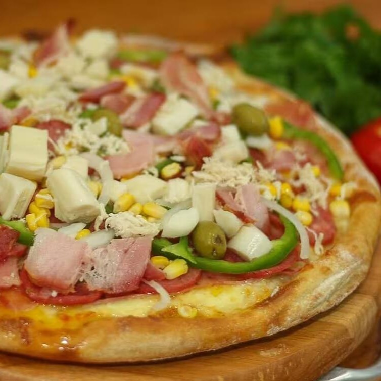 Uma pizza deliciosa e suculenta com molho de tomate, queijo muçarela, presunto, ovos, pimentão, cebola e azeitonas. Um clássico irresistível para quem ama sabor de verdade. Perfeita para compartilhar com amigos!