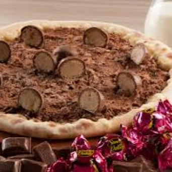 Deliciosa pizza doce, chocolate, amendoim triturado, e bombom sonho de valsa
