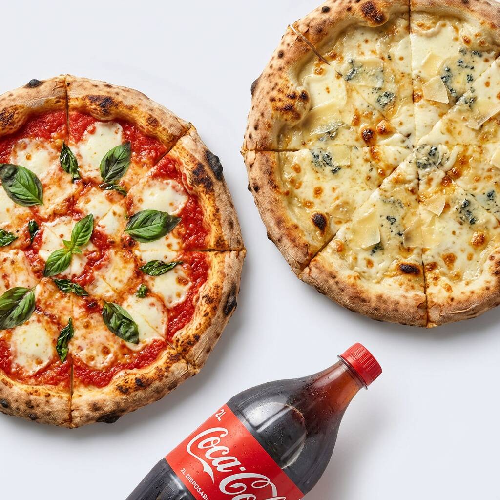 Escolha até 4 sabores sendo 2 em cada pizza de 8 fatias mais uma coca geladinha