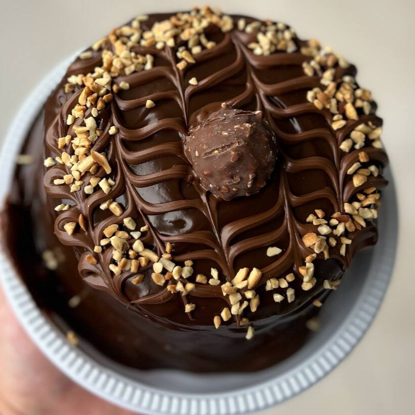 Massa de cacau black recheado com brigadeiro cremoso intenso, amendoim triturado e Nutella. Finalizado com bombom Ferrero Rocher
