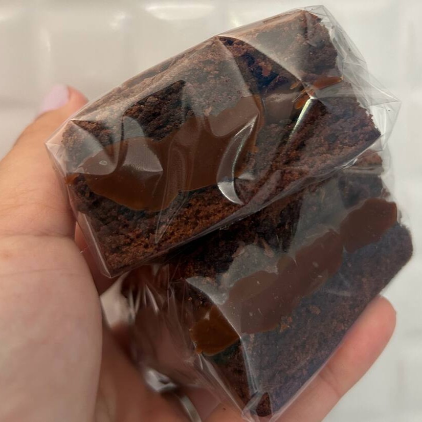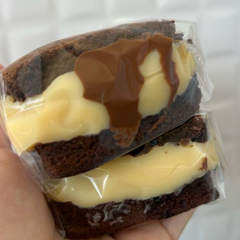 Pedaço de brownie molhadinho com uma camada cremosa de brigadeiro ao leite.