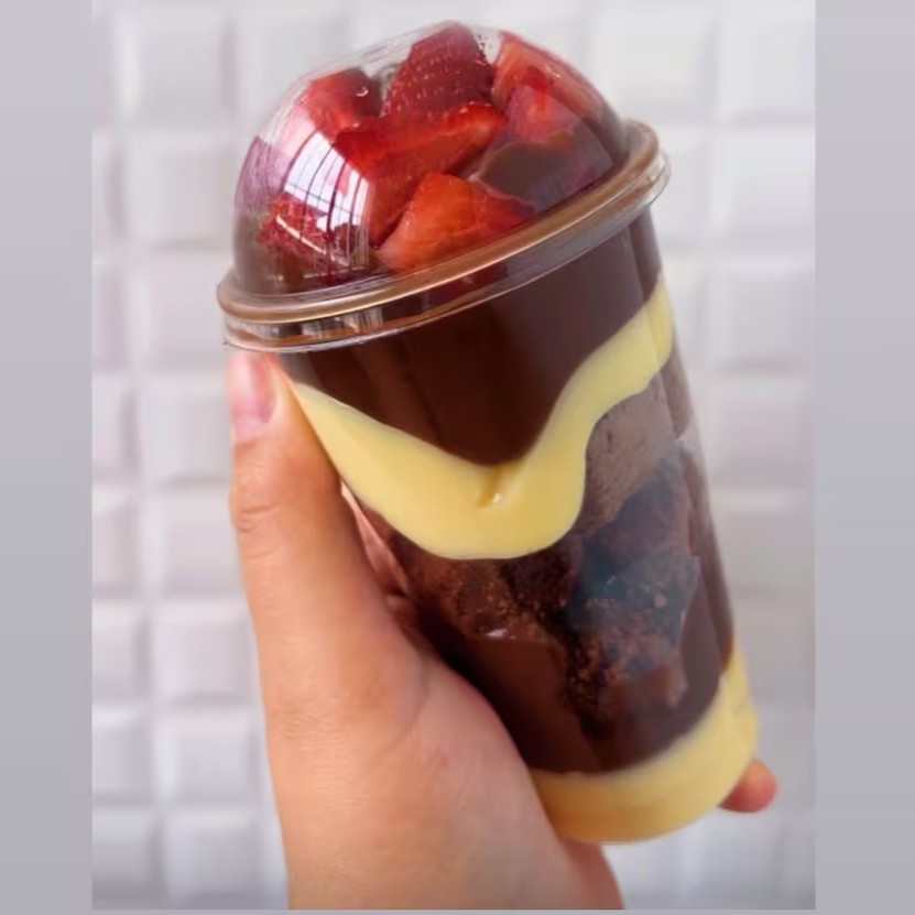 Camadas de brigadeiro de ninho, brigadeiro tradicional ao leite, brownie e finalizado com morangos frescos