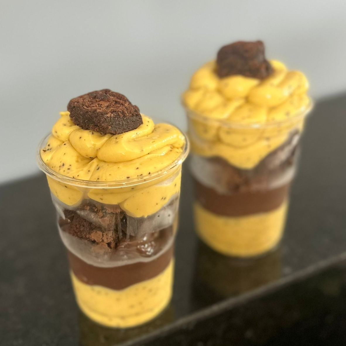 Brigadeiro de maracujá, brigadeiro tradicional, brownie e finalizado com mais brigadeiro de maracujá.