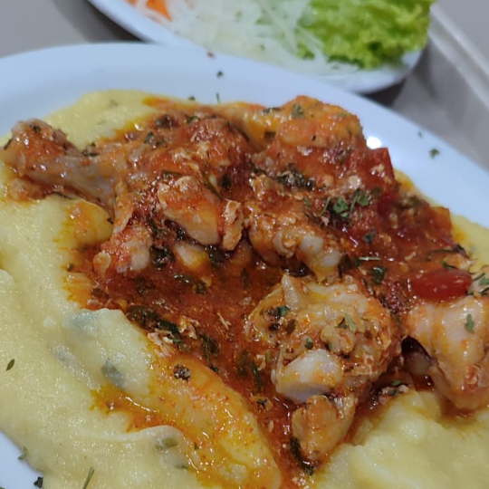 Suculenta Coxinha de Frango ao Molho com Polenta, Arroz, Feijão, mais 2 Guarnições a sua escolha