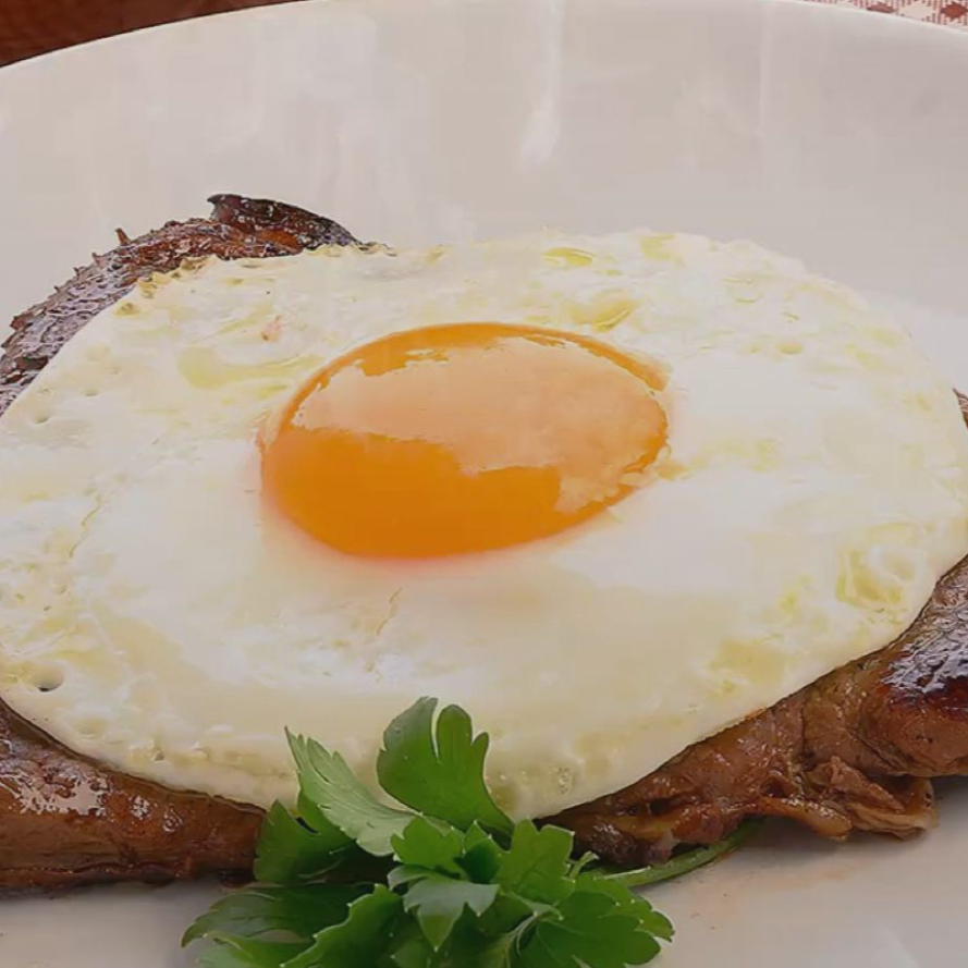 Bife suculento com ovo, Arroz, feijão, mais 2 guarnições a sua escolha.