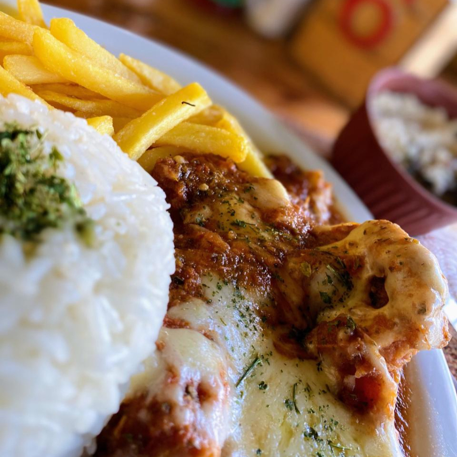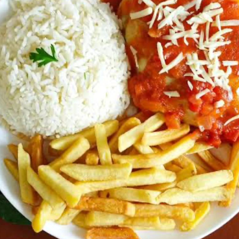 Suculento Frango à Parmegiana com molho de tomate caseiro e queijo mussarela derretido, acompanha arroz, feijão, batata frita mais 1 guarnição a sua escolha.