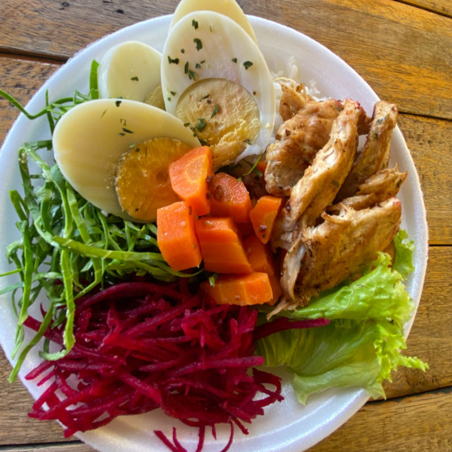Arroz, filé de frango grelhado ou bife grelhado, ovo cozido, refogado do dia e salada do dia.