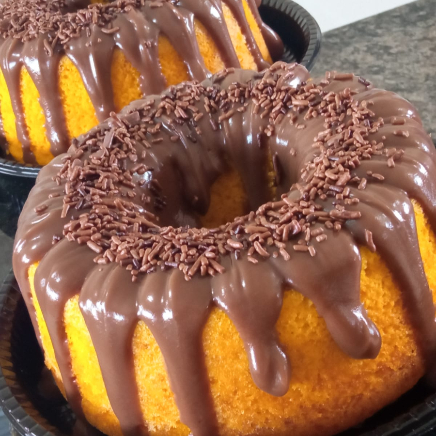 Delicioso bolo de cenoura caseiro com uma generosa cobertura de chocolate ao leite.