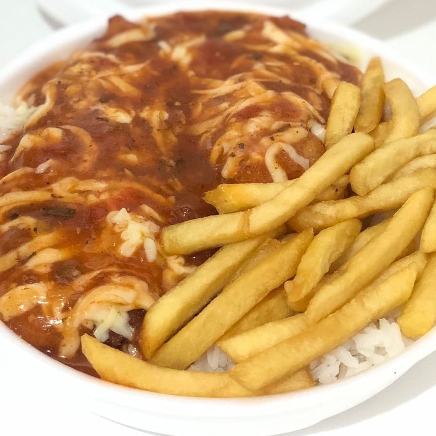 Saboreie nosso Marmitex (P) com suculento filé de frango à parmegiana. Este prato é cuidadosamente preparado com um filé de frango empanado e revestido com molho de tomate e queijo derretido, proporcionando um sabor rico e autêntico. Acompanha arroz fresco, cozido à perfeição e batatas fritas crocantes e douradas. Uma refeição completa, balanceada e deliciosa, ideal para o seu almoço.