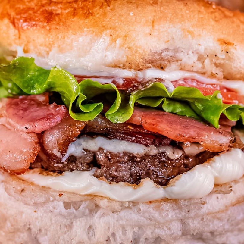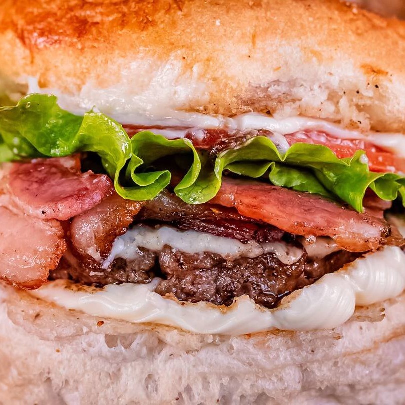 O nosso lanche é composto por: Pão, carne, queijo, bacon, cebola caramelizada, Catupiry (verdadeiro), alface e tomate + fritas. Consumo Imediato.