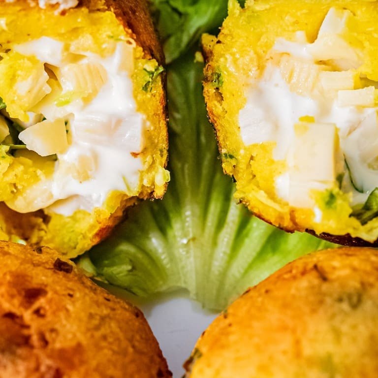 Delicioso Bolinho de Mandioca com Alho Poró Catupiry, gorgonzola e mussarela.