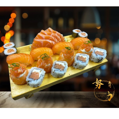Um com 36 Peças, o Osaka é um combinado inspirado na sua tradição e cultura da culinária da cidade onde antigamente só se apreciava somente um tipo de peixe por vez: 8 Sashimi de salmão 4 Niguiri de salmão 8 Hossomaki de salmão 8 Uramaki Philadelfia (salmão com cream cheese) 8 Jõ tradicional de salmão com cream cheese e cebolinha