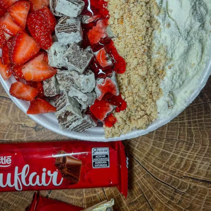 Amendoim crocante, morango, cobertura de morango, Nutella 2x, frozen (grego), paleta morango (fatiada), suflair.