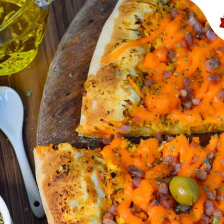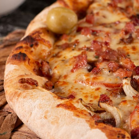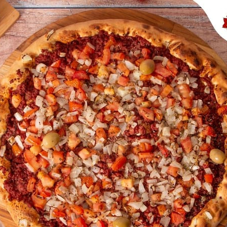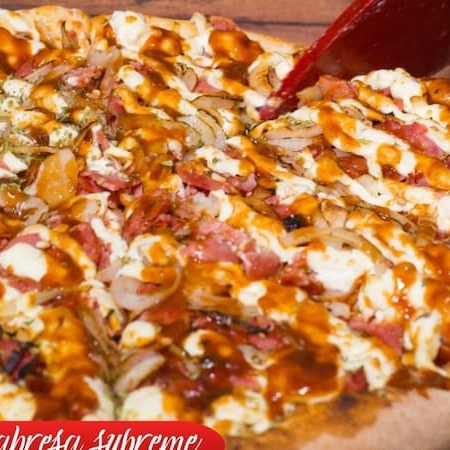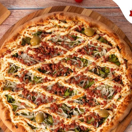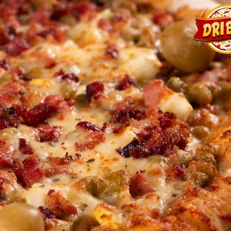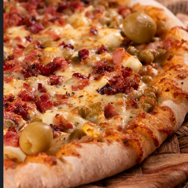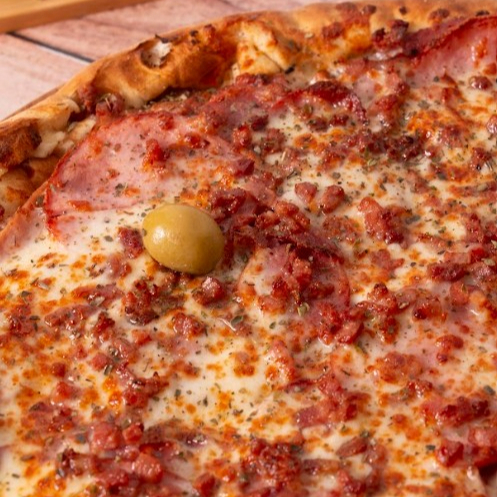 Massa Tradicional, Molho de tomate caseiro Dribix, Lombo, calabresa moída, ovos, mussarela, queijo catupiri e bacon