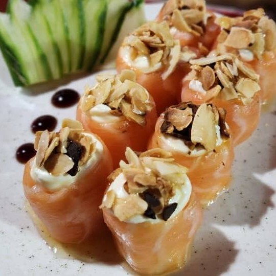 8 unidades de Dyos de amendoas e mel com salmão cru envolto no arroz, cream cheese mel e amendoa por cima.