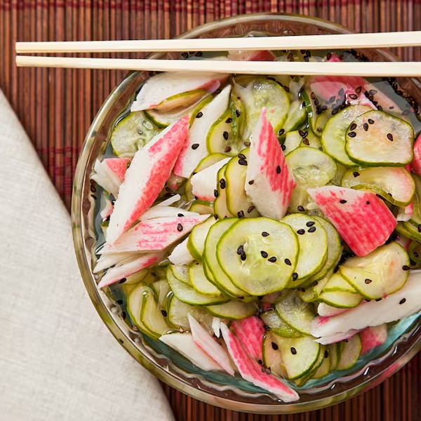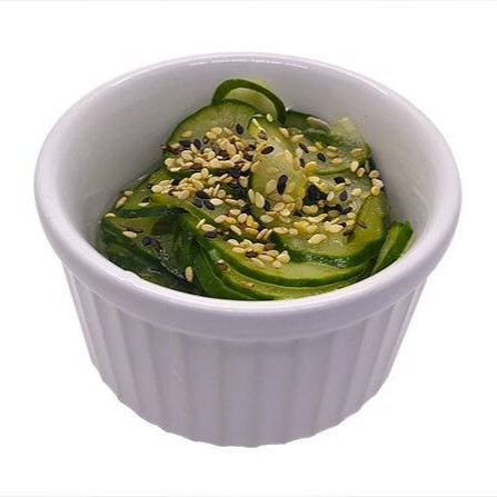 250gr de Pepino ralado com pedaços de Kani ao molho agridoce e finalizado com gergelim.