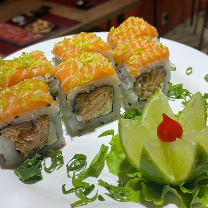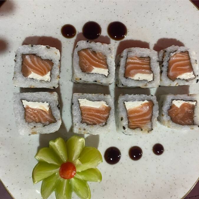 8 unidades de sushi de salmão grelhado envolto com alga nori, arroz e gergelim.