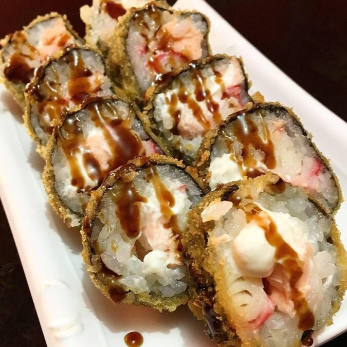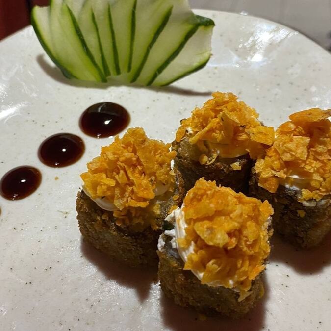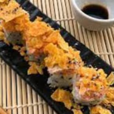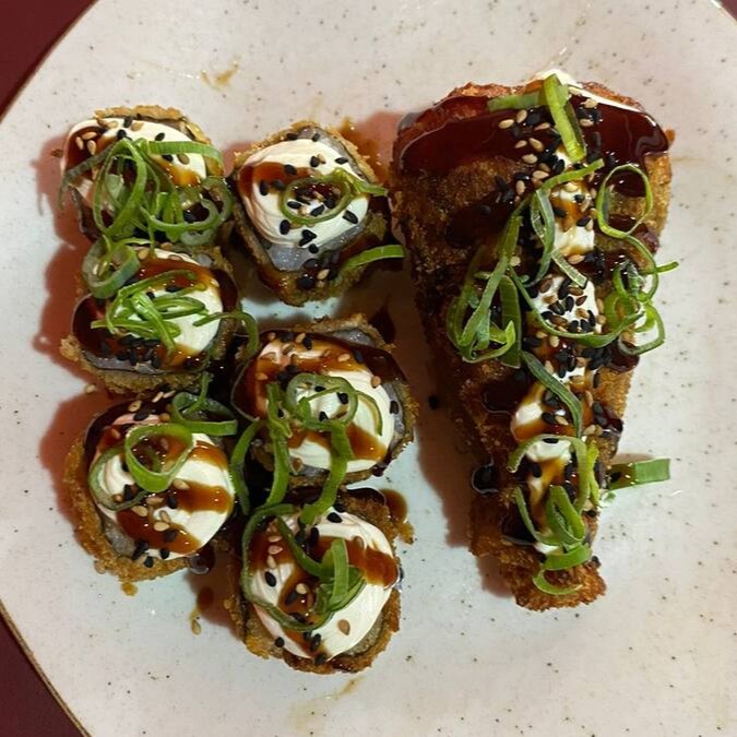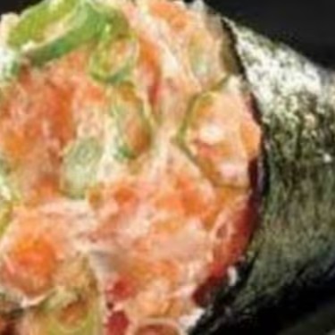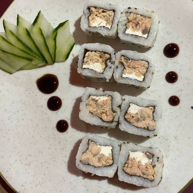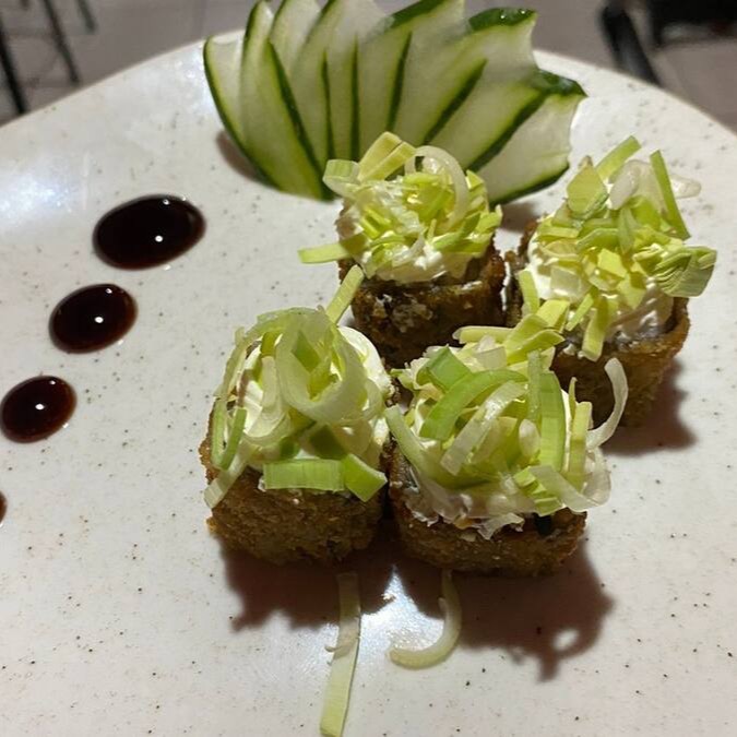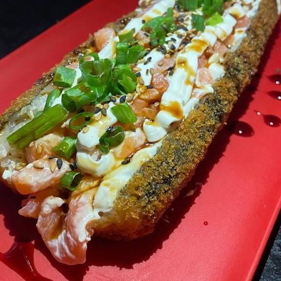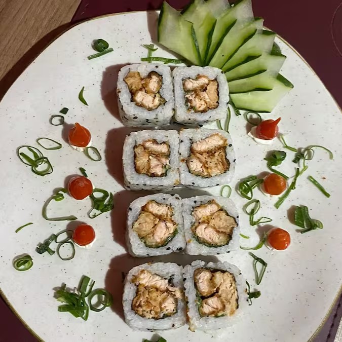 (8 unidades) salmão empanado com maionese e cebolinha, envolvidos em alga nori e arroz com gergilim.