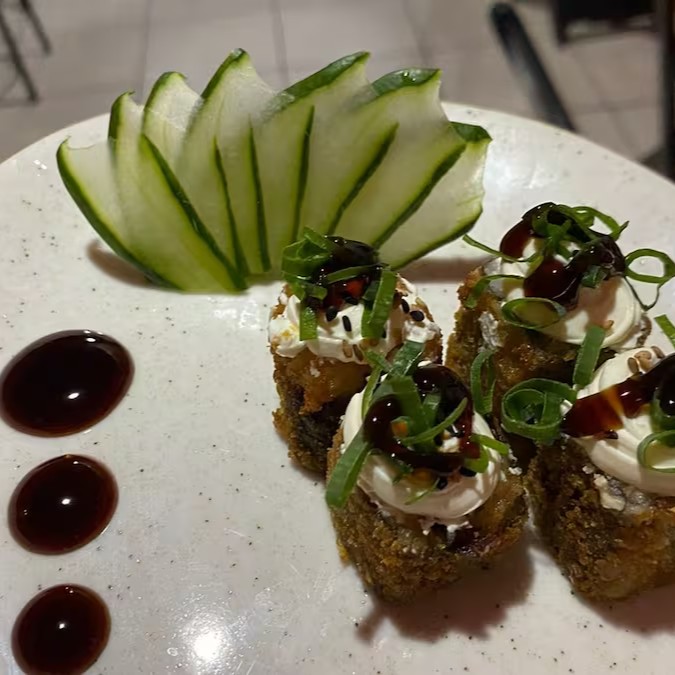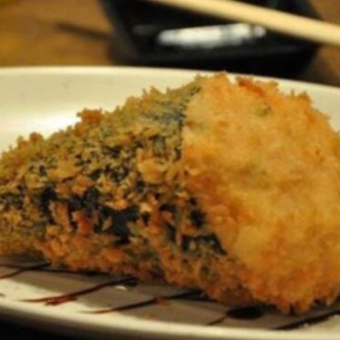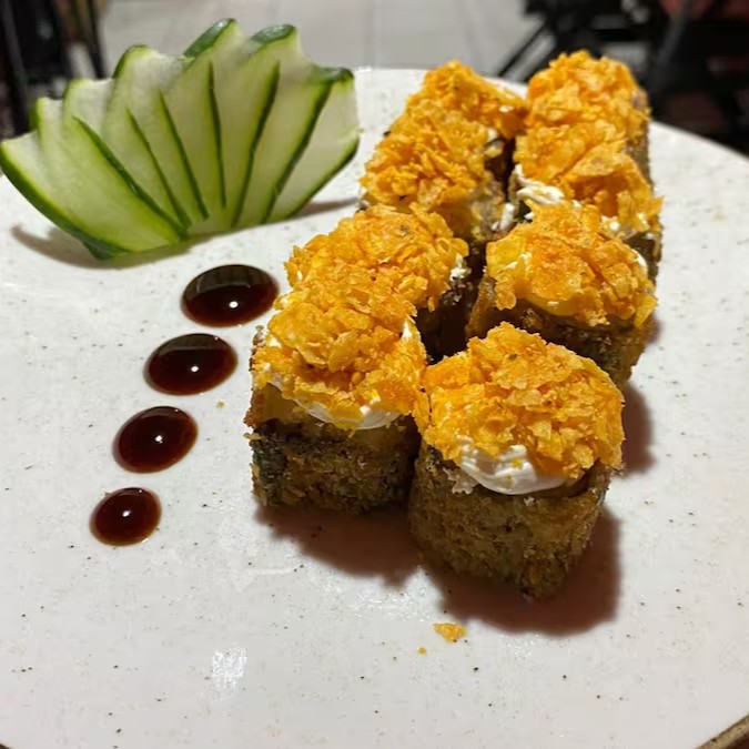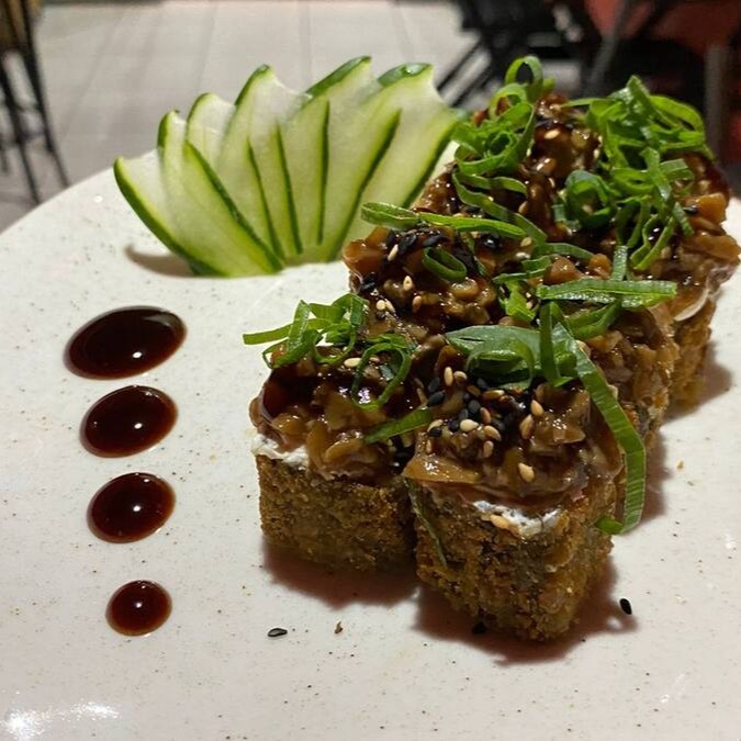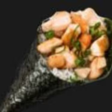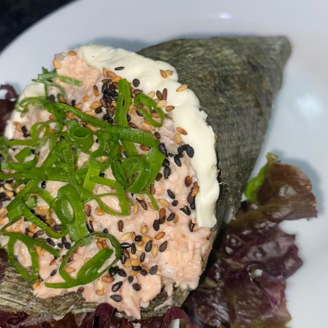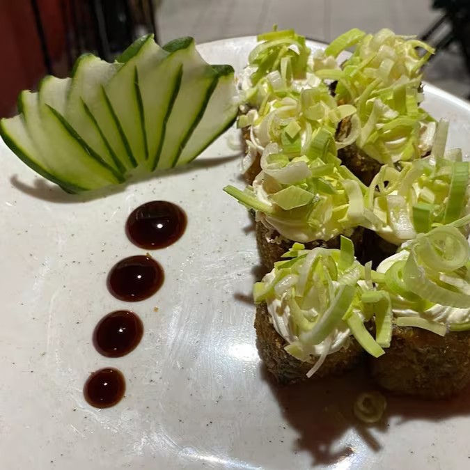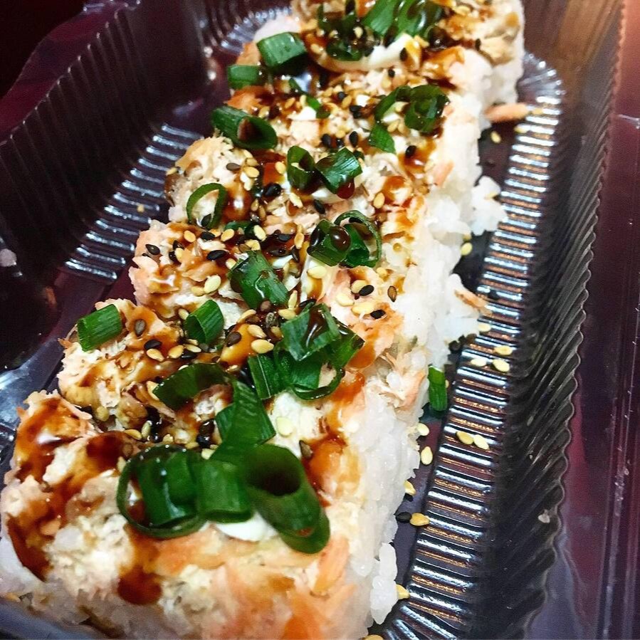 (8 unidades) salmão empanado com maionese e cebolinha, envolvidos em alga nori e arroz com gergilim.